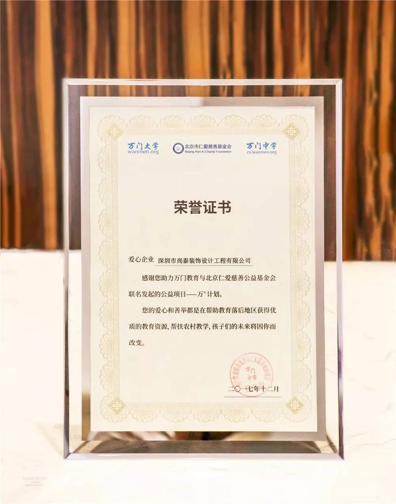 2017年12月11號(hào),萬(wàn)門(mén)發(fā)起 #萬(wàn)?計(jì)劃# 活動(dòng),尚泰裝飾與萬(wàn)門(mén)大學(xué)等100多家企業(yè)、機(jī)構(gòu)和組織參與了這次活動(dòng),一起攜手助力農(nóng)村教育扶貧,匯聚n種微小力量為農(nóng)村中學(xué)捐贈(zèng)優(yōu)質(zhì)在線課程,致力于降低農(nóng)村教育的門(mén)檻。