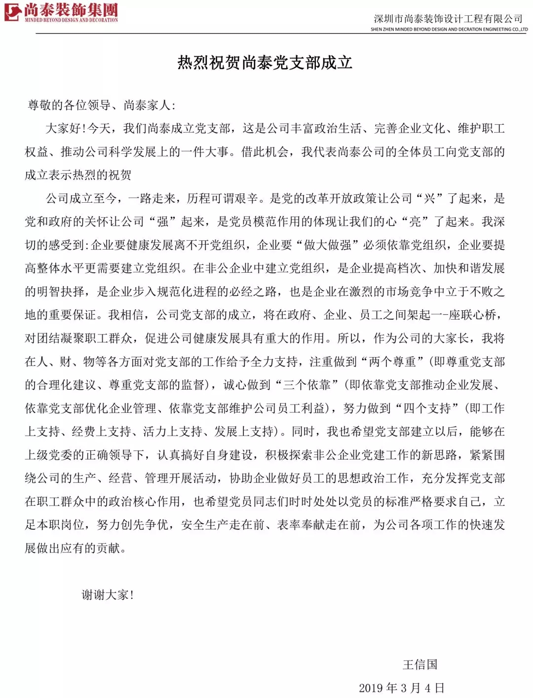 尚泰裝飾集團(tuán)董事長王信國先生對尚泰裝飾黨支部成立的祝賀信。