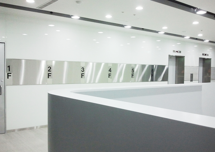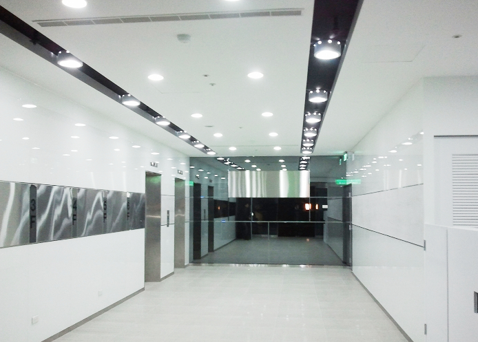 裝修過(guò)后的大廳,將原本走道的接待柜臺(tái)移除,恢復(fù)走道應(yīng)有的大小。走道地面貼上拋光石英磚,左右墻面貼上了烤漆玻璃,電梯旁墻面則搭配了金屬板,讓天花板筒燈的燈光直接打在墻面與地面上。