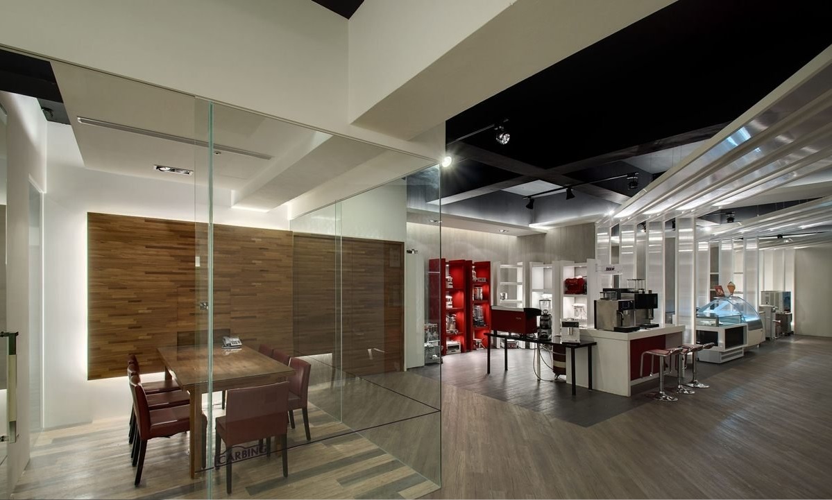 主要建材:木絲水泥板、黑色烤漆玻璃、白色烤漆板