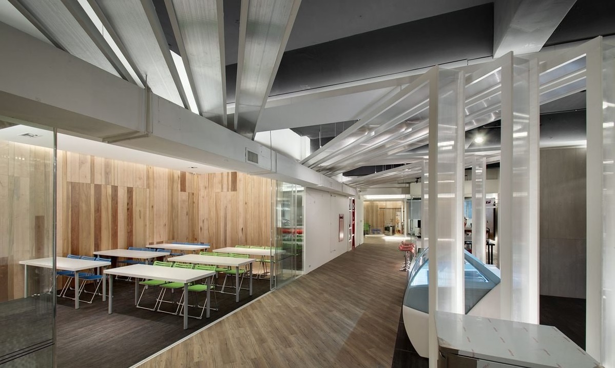 來到門口接待處,明亮鮮活的草綠色墻面讓人精神抖擻,同時(shí)也是企業(yè)標(biāo)準(zhǔn)色與空間的完美結(jié)合,借此讓來訪的客戶能夠?qū)ζ髽I(yè)留下活潑鮮明的第一印象。位于接待處墻面后方的是大會議室,設(shè)計(jì)師利用清玻璃搭配草綠墻面,作為會議室與接待區(qū)之間的區(qū)隔,同時(shí)兼顧了會議空間的隱私性與采光通透的需求,而借由清玻璃的視覺穿透效果,使會議室的木質(zhì)感主墻與前方綠色墻面形成呼應(yīng),帶來欣欣向榮的蓬勃朝氣。
