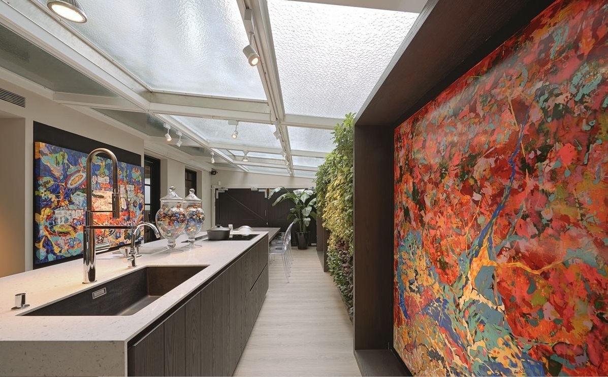 腦力刺激過(guò)后需要的是極致的放松,松弛有度才是讓創(chuàng)意源源不絕的長(zhǎng)久之計(jì),Idan沒(méi)有忘記要讓員工保持健康的身心,于是,走過(guò)如夢(mèng)似畫(huà)的廊道,映入眼簾的是結(jié)合現(xiàn)代時(shí)尚的開(kāi)放式中島餐廚區(qū),主墻是一大片延伸室外窗景的植生墻植披,天窗灑下的是令人羨慕的自然光,超大幅的畫(huà)作與綠墻一起環(huán)繞著質(zhì)地溫潤(rùn)的會(huì)議長(zhǎng)桌,即使再討厭開(kāi)會(huì),心情也會(huì)隨著飄散開(kāi)來(lái)的巴西莊園咖啡香飛揚(yáng)。