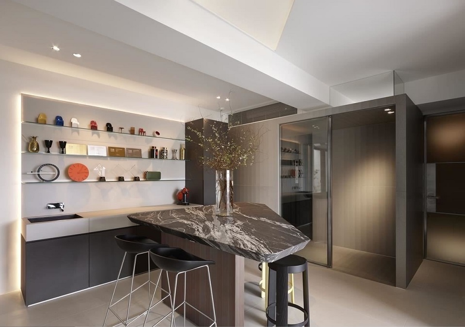 兼具接待、休息與會議的區(qū)域,擺放花崗石面、不規(guī)則切割的桌,讓空間、動線更活潑。