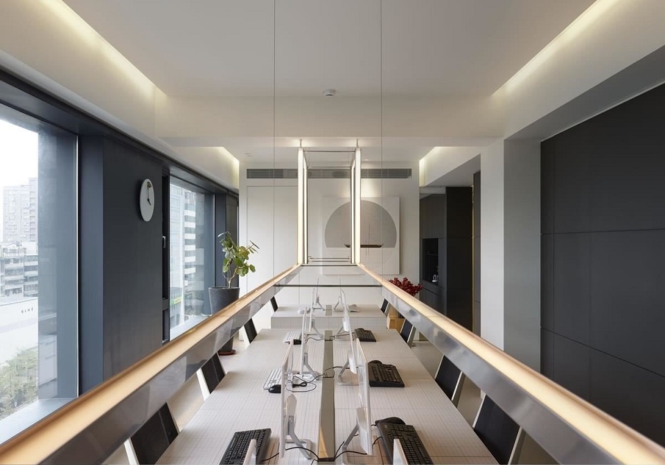 辦公區(qū)將鐵件LED燈置中,以墻面、窗景呼應(yīng),展現(xiàn)設(shè)計人對比例的極致追求與對稱之美。