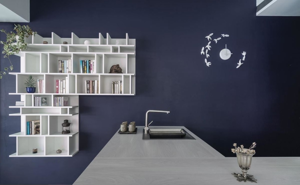 清新的白色天花板與柜體,與深藍墻面搭配出優(yōu)閑的生活感。
