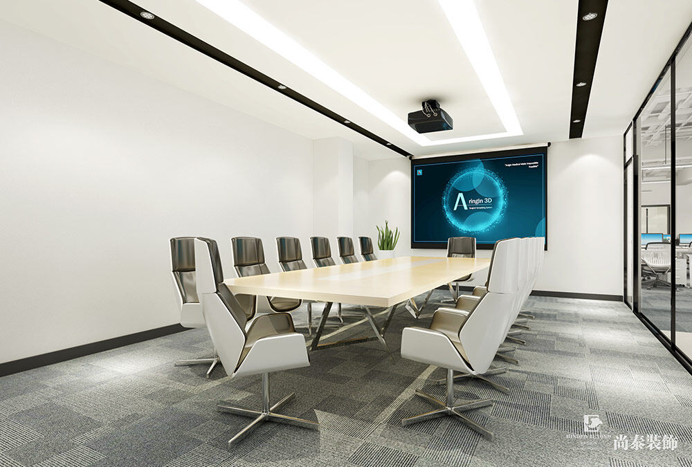 空間格局:大廳、視聽(tīng)室、會(huì)議室兩間、辦公區(qū)、茶水間、資料室、主管休憩區(qū)