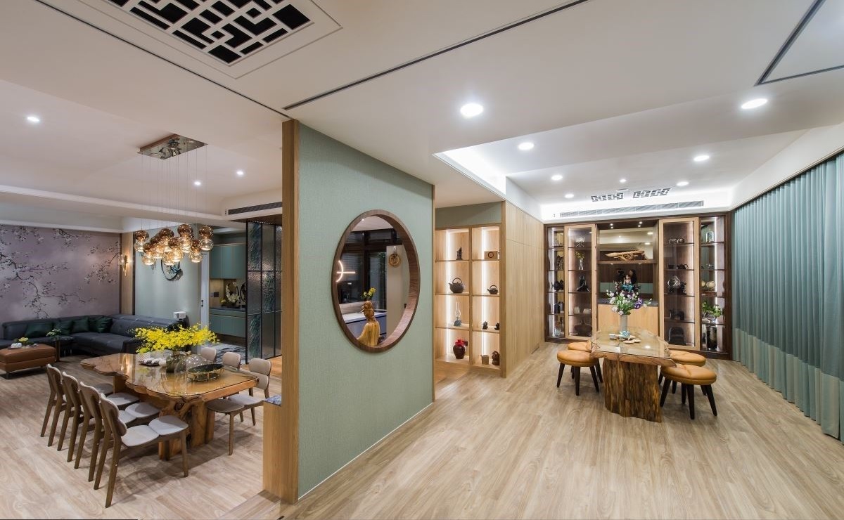 60坪的空間里,為了打造屋主期待結合辦公室與招待所的需求,尚泰裝飾的設計師屋主喜愛的新古典元素為基底,并融入男屋主收藏的檜木藝術,透過異材質創(chuàng)意巧思,混搭出充滿東風禪意與華麗古典的新穎美學。