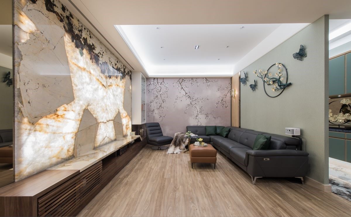 玄關鋪陳雪山藍大理石地坪,與一旁運用青花瓷打造的大理石臺面與藝術品陳列,交織出雅致非凡的迎賓風尚;以窯燒玻璃與鐵件搭建一道頂天的屏風,穿透的肌理讓光線可自在流淌一室,且結合180度旋轉的活動設計,可依需求調整立面位子,達到避開風水禁忌的疑慮。電視墻以絕美石材打造,鮮明的獨特肌理與色澤,搭配兩面背墻分別以枝葉花卉壁紙,與蝴蝶裝置藝術的自然語匯,特調出無限自然生命力。
