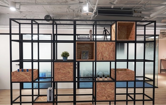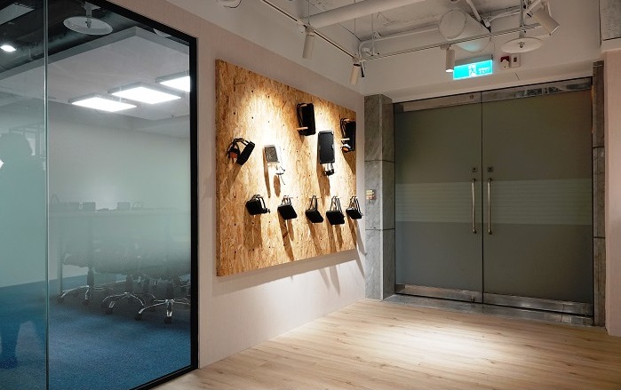 一進入辦公室公司名稱及產(chǎn)品印入眼簾,承襲公司一貫的簡約風(fēng)格,深色墻面搭配純白字體將視覺集中于產(chǎn)品上,讓產(chǎn)品成為空間的裝飾品,不做過多的設(shè)計搶走產(chǎn)品的重要性;展示墻使用OSB洞洞板負責(zé)吊掛陳列商品,配合不同需求變化各種展示方式。