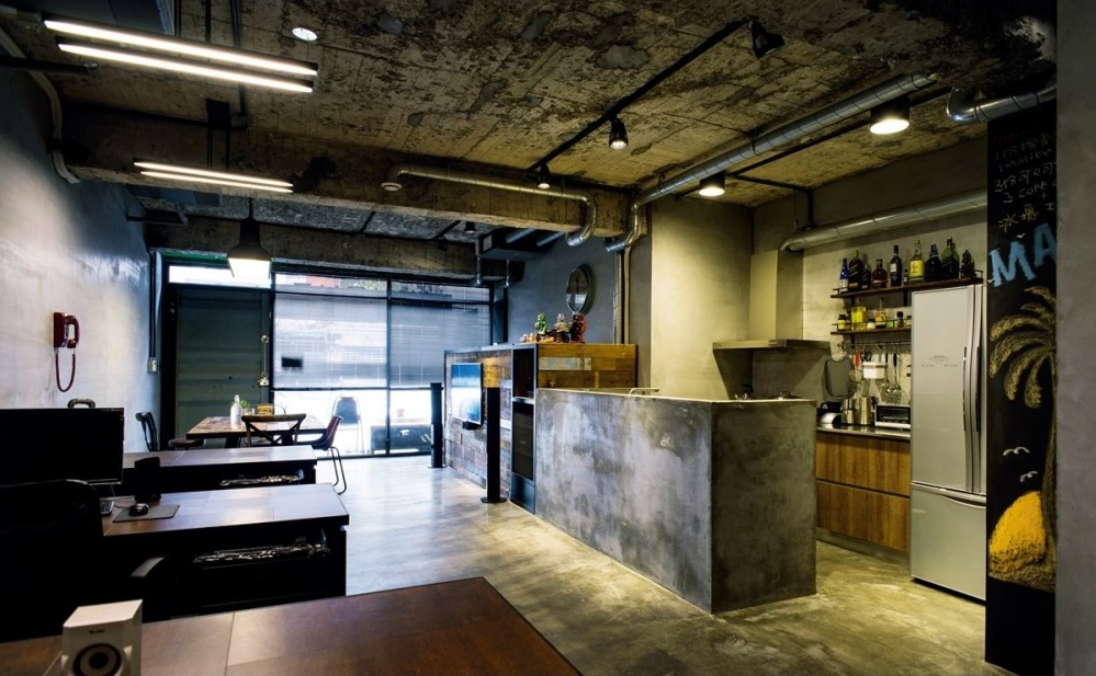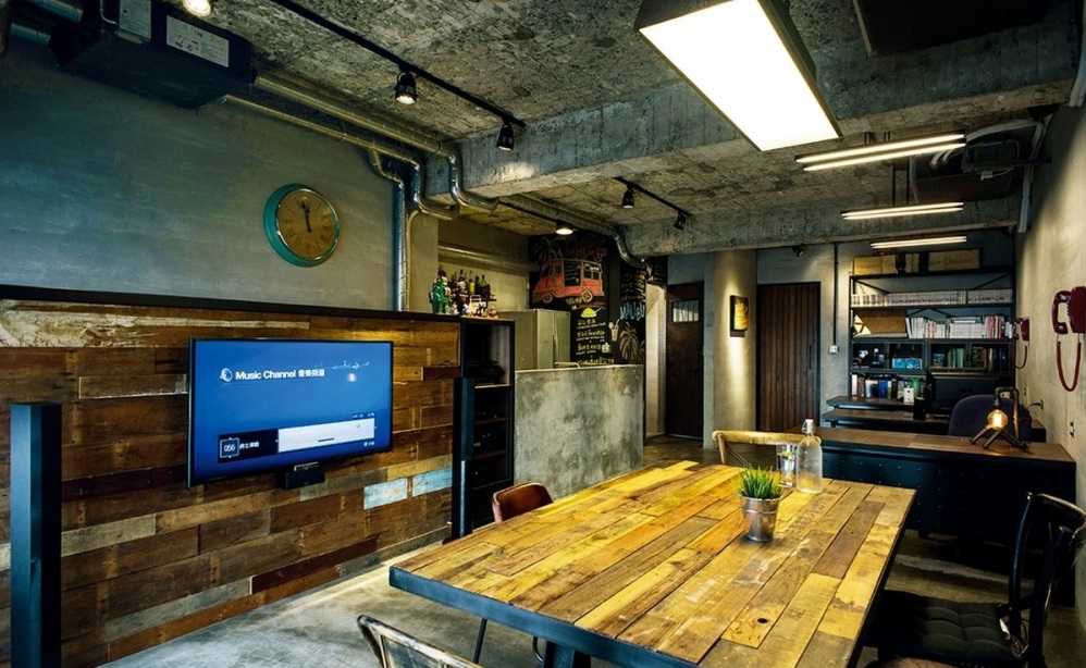 由于是將工作室結(jié)合臨時(shí)住宅的機(jī)能,方便兩人與同事工作之馀也能在這個(gè)空間休憩與沉淀,因此開(kāi)放的格局及多元?jiǎng)泳€規(guī)劃是首要考量,將原本陽(yáng)臺(tái)連結(jié)室內(nèi)的隔間拆除,采用大面玻璃窗及采光罩,導(dǎo)入大量光線,加上貨柜門(mén)的大門(mén),從這里就感受到粗獷隨興的工業(yè)風(fēng)格;公共區(qū)域除了工作區(qū)外,設(shè)計(jì)師將原本在屋后端的廚房移到公共空間,用水泥粉光打造中島吧臺(tái),營(yíng)造出個(gè)性又原始的廚房,結(jié)合原木大餐桌的形式,讓這里成為員工開(kāi)會(huì)及接待顧客的場(chǎng)域,也可以是休閑放松的客餐廳及聚會(huì)場(chǎng)所,廚房旁邊的客衛(wèi)隔間墻采用黑板漆打造涂鴉墻,設(shè)計(jì)師特別為客衛(wèi)打造一扇宛如監(jiān)獄門(mén)的門(mén)片,增加不少趣味性,也展現(xiàn)設(shè)計(jì)師的創(chuàng)意、風(fēng)格及個(gè)性。