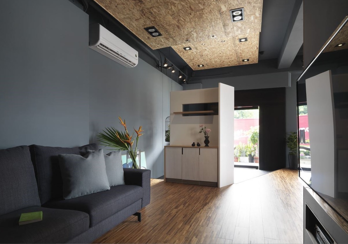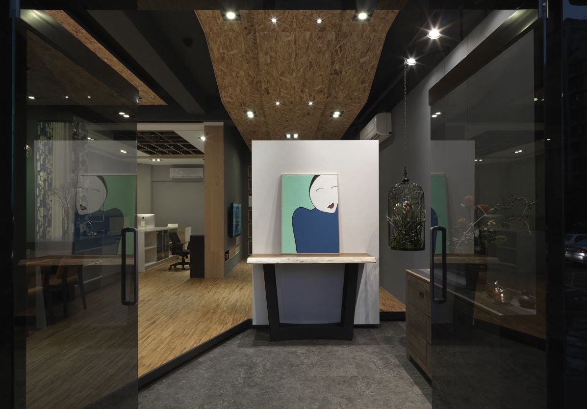 進(jìn)入空間之前,黑色烤漆搭配清玻璃打造而成的大門,已透露了空間的現(xiàn)代美學(xué)質(zhì)感,讓人留下最佳印象。而空間內(nèi)部則根據(jù)使用需求,將格局大致區(qū)分為工作區(qū)、洽談區(qū)、沙發(fā)區(qū)、儲(chǔ)藏室及茶水間等。入口玄關(guān)處一道白色藝術(shù)端景墻讓視覺效果得到緩沖,并且具有指引動(dòng)線的作用,上方的折線型木質(zhì)感天花板,巧妙展現(xiàn)了幾何造型美學(xué),讓人一進(jìn)門便感受到濃厚的藝術(shù)設(shè)計(jì)氣息。再往內(nèi)走,玄關(guān)端景墻后方是沙發(fā)區(qū),讓來訪的客戶可以在此暫時(shí)休憩,灰色電視墻與書墻形成完整空間感,營(yíng)造出居家空間般的舒適氛圍。