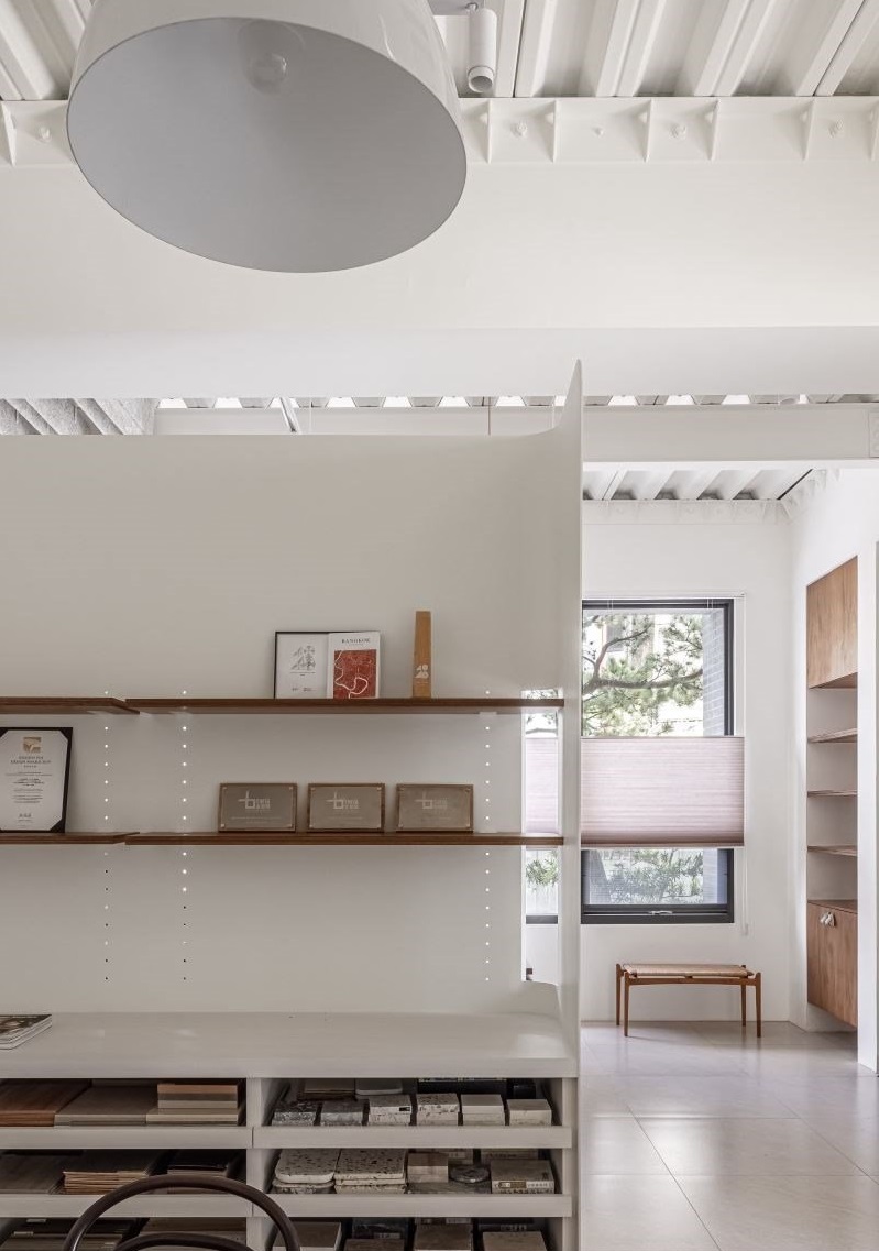 二樓主要辦公空間采開放式設(shè)計優(yōu)化空間感與采光,也方便工作時彼此交流討論;靠窗處以白色貨架打造的書墻有活動輪可恣意移動,白色軌道燈能隨時調(diào)整照明角度、存在感也不過于強烈而壓迫空間;另一側(cè)則運用梁下空間以木作打造收納柜,滿足工作所需的儲藏空間亦能感受到辦公室留白的清爽感受。