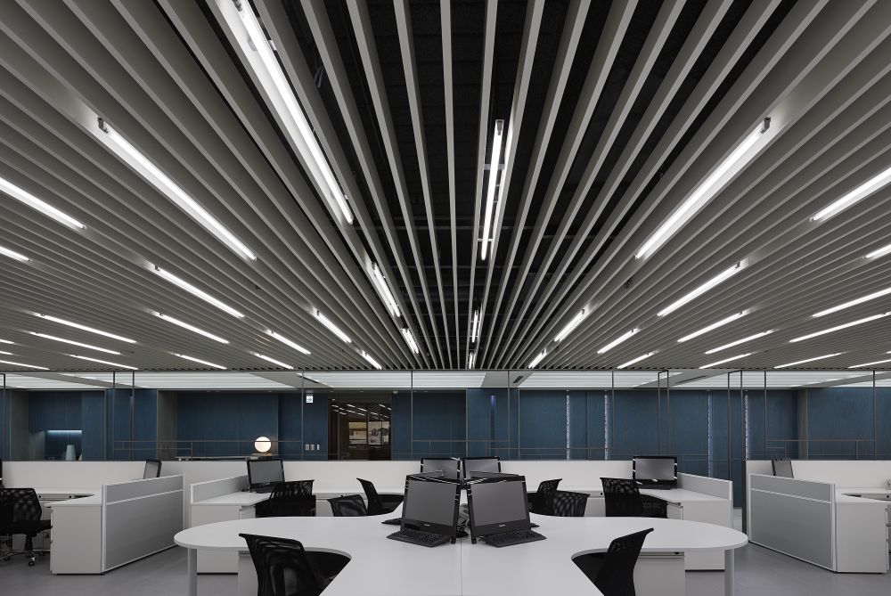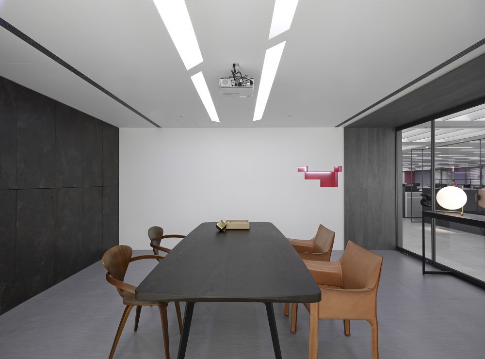 大量使用企業(yè)主色之一的深藍(lán)妝點,讓空間跳脫單調(diào)沉默之感,木板中偶爾銜接藍(lán)色沖孔版,讓墻面有光影流動更顯層次與趣味。天花以強(qiáng)烈的直束光帶延伸了天花板的視覺,也拉高了空間感。