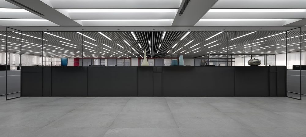辦公區(qū)前方線條剛直的黑色展示鐵架,在剛硬之中卻保留了彈性,總監(jiān)透過橫向高低不一的線條設(shè)計結(jié)合展示臺讓此區(qū)完美帶出了藝術(shù)與層次。