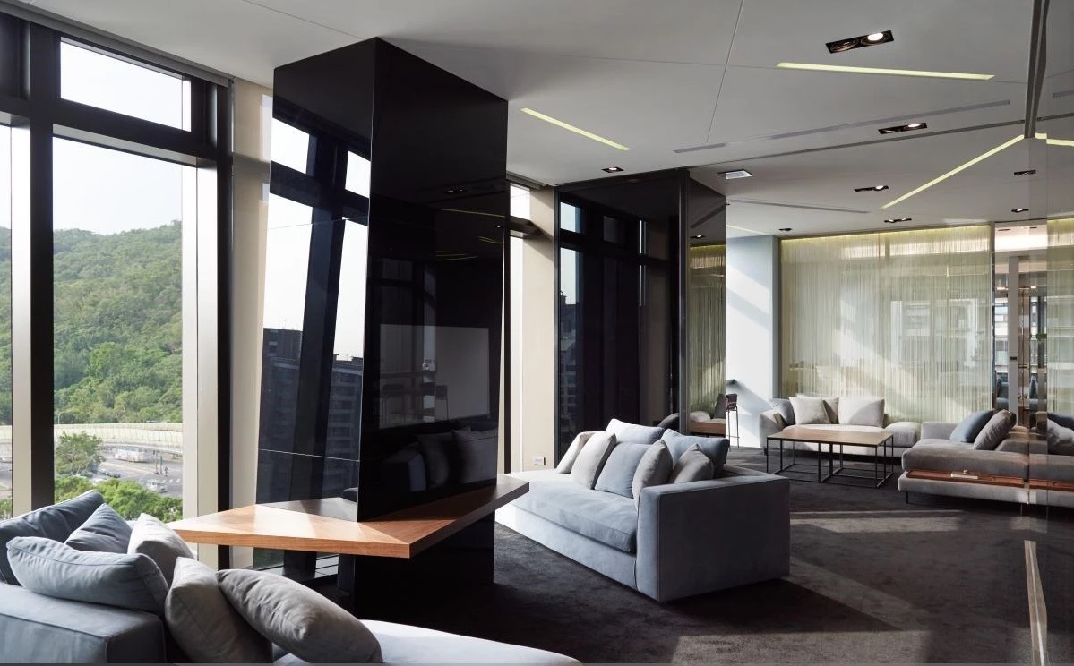 整體空間里,精心選擇鏡面、玻璃、烤漆等建材,以通透性十足的特質(zhì),成功帶出高級(jí)的時(shí)尚感受,并且扭轉(zhuǎn)一般的格局架構(gòu),透過不同空間的互補(bǔ)連結(jié),營造便利流暢的出入動(dòng)線。同時(shí),設(shè)計(jì)師把握現(xiàn)場的挑高優(yōu)勢(shì),描繪寬敞舒適的空間感,加上富有變化的天花設(shè)計(jì),巧妙帶入俐落的燈帶裝飾,在明暗之間,一展光影流動(dòng)的層次趣味。最后來到會(huì)客區(qū),在大篇幅的綠意山景陪伴下,沐浴在溫暖日光里,帶給賓客放松無壓的空間氣息,卸下洽談商務(wù)的緊張氛圍。