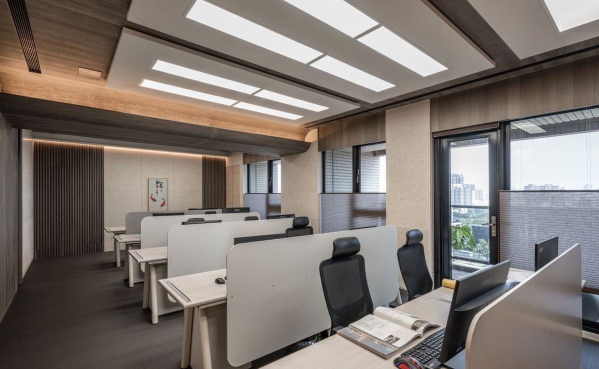 180平商業(yè)空間為深圳尚泰裝飾設(shè)計(jì)的辦公室,場(chǎng)域內(nèi)鋪敘溫煦木質(zhì)調(diào),以色彩傳遞空間所需的暖度,更添設(shè)間接光源升華設(shè)計(jì)層次;其次,設(shè)計(jì)師更運(yùn)用精湛的設(shè)計(jì)手法,化解了空間內(nèi)顯著的窘?jīng)r,同時(shí)以立面設(shè)計(jì)藏匿門(mén)片,穿透感屏風(fēng)也于無(wú)形中弱化了場(chǎng)域間的分野。