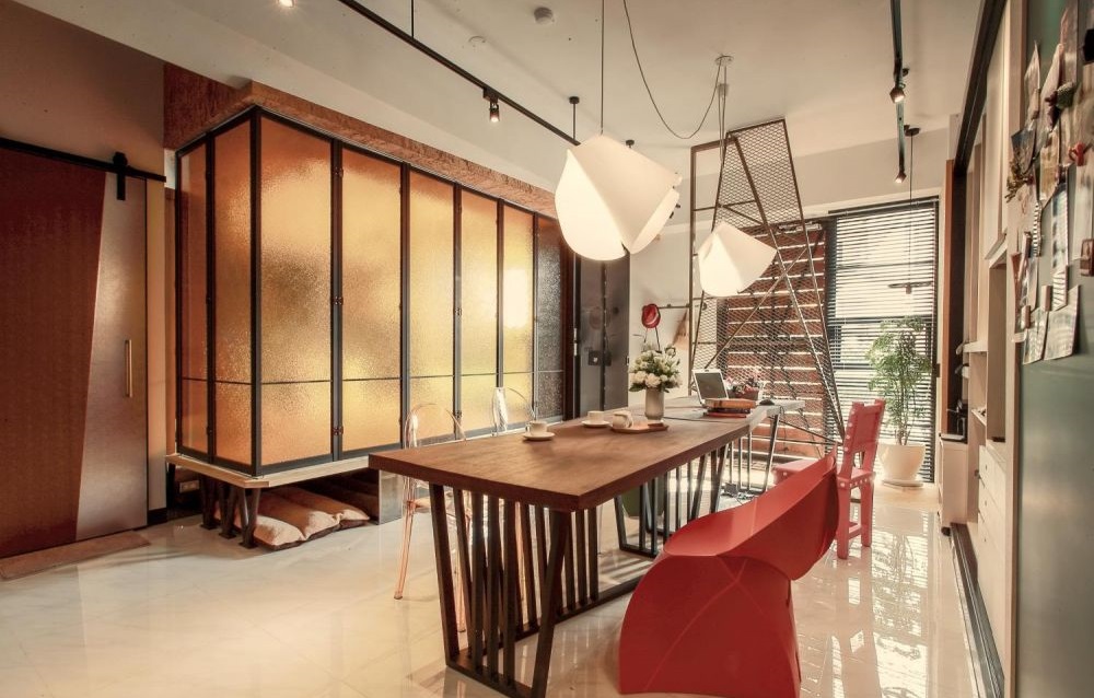客廳邊獨(dú)立縫紉工作室不僅窗明幾凈,玻璃鐵框折疊門更讓居家生活與工作空間拉近距離,而開放餐廚區(qū)與大餐桌則可讓工作放松,也可轉(zhuǎn)換為工作討論區(qū)。另一案例為美甲店,舒適溫暖的居家布置與商品陳列相輔相成,也方便客戶挑選,而后方工作區(qū)則以波紋玻璃門來提高隱私性。