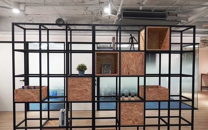 主要建材:鋁框玻璃隔間,SPC木紋地板,防焰方塊地毯,OSB板,造型壁紙,磁性烤漆玻璃