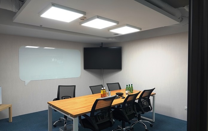 從走道望向進(jìn)門的方向,燈光充足,產(chǎn)品放置明確,耐磨地板使得員工在搬運(yùn)商品的過程中方便許多,利用畸零的機(jī)電室兼做儲物室,隱藏門的工法讓儲藏室入口不突兀;走道利用訂制金屬格架區(qū)隔空間,增加穿透感又可以儲物展示裝飾,一舉多得。設(shè)計(jì)重點(diǎn)│會議室小型會議室隔間玻璃中段霧化保有會議空間基本隱私又不完全遮蔽視線,會議內(nèi)部空間以簡單俐落的設(shè)計(jì)搭配墻面上的造型磁性烤漆玻璃,為空間增添一點(diǎn)活潑的氣息;作業(yè)區(qū)不僅簡單明了且空間明亮,強(qiáng)化作業(yè)時(shí)的專注力。設(shè)計(jì)重點(diǎn)│辦公討論區(qū)