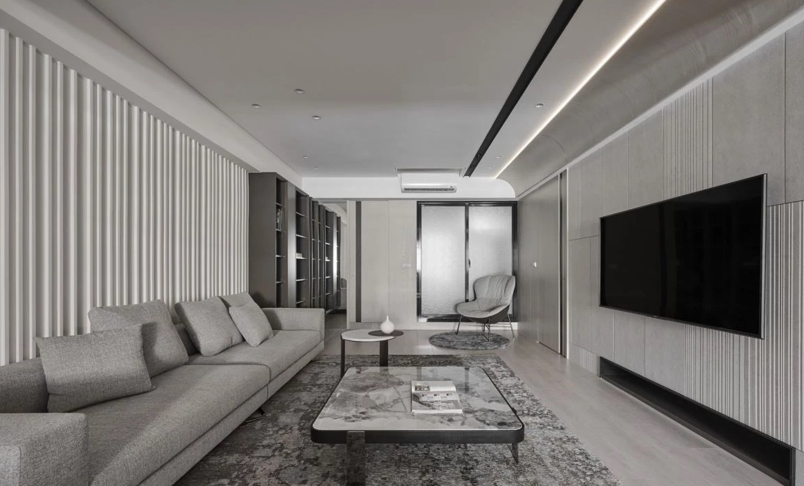 考量到屋主育有新生兒,因此公共空間維持開放式設(shè)計,把廚房、餐廳、客廳規(guī)劃于同一軸線上,即便是在廚房做菜,也可以隨時照看小朋友,感到安心。天花板在電視墻的一側(cè),借由圓弧造型修飾,弱化梁柱帶來的方正感,而通往私領(lǐng)域的門片,也都融入墻面線條里,讓視覺顯得簡潔俐落。