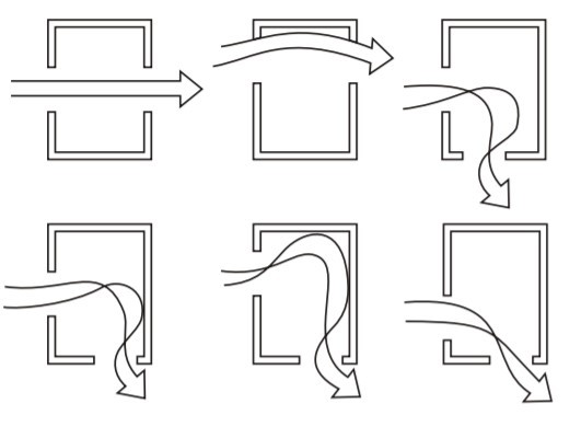 只要在室內(nèi)設(shè)計(jì)時(shí)調(diào)整風(fēng)口的位置,就能利用自然的空氣流動改善室內(nèi)溫度。設(shè)置窗戶與門的位置會影響空內(nèi)氣流。上圖展示了不同對流風(fēng)的效果,當(dāng)中把門和窗設(shè)置在對角的話,能營造較大也較寬的對流風(fēng),該區(qū)域就會有足夠的風(fēng)來降溫。