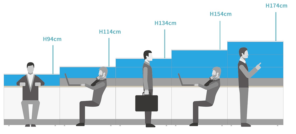 超過坐姿視覺高度,可有效阻隔視野,提供良好的私密性和隔音效果,需站立始能呈現(xiàn)交流與溝通,適用稍具私密性之財(cái)務(wù)、法務(wù)、企劃、或簡易區(qū)隔部門別或做為部門管理職的辦公桌規(guī)劃,