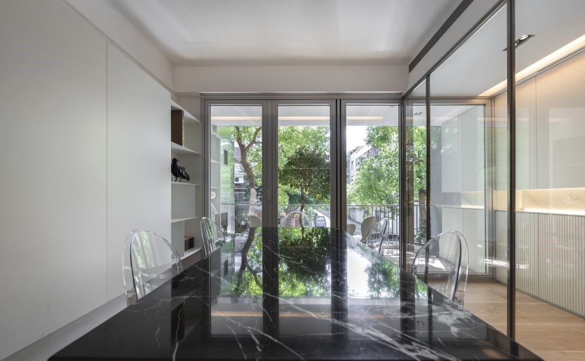褪去學(xué)生身分正式踏入社會(huì)后,工作環(huán)境就成了第二個(gè)人們久待的處所;擁有一個(gè)舒適自在的工作環(huán)境其重要程度不亞于居家空間,業(yè)主深知其重要性便邀請(qǐng)俱意設(shè)計(jì)改造年久力衰的商辦空間。 踏入僅有80平的商辦空間,預(yù)期中擁擠狹小的空間卻不曾出現(xiàn)過;嚴(yán)選義大利進(jìn)口木紋磚、石英薄板及抗指紋門板等素材,鋪敘出簡(jiǎn)約大方又明亮的現(xiàn)代風(fēng)室內(nèi)空間。利用清玻作為全室隔板,創(chuàng)造通透視野營(yíng)造出寬敞的空間感;二樓向外延伸造景陽臺(tái)作為一方端景,不但援引日光更擺放大型落地盆景為商辦空間添上一筆春意。 室內(nèi)采全開放式格局,辦公區(qū)更貼心考量最適距離為同仁打造自在工作場(chǎng)域;共用空間擺上一張黑色大理石紋桌,緊鄰著中島流理臺(tái)搖身一變成為多功會(huì)客空間及休息區(qū)。