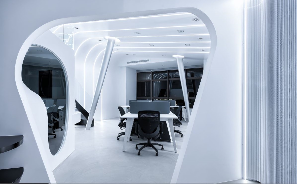 深圳尚泰裝飾的設計師運用未來與太空艙為核心概念,融入 28 坪的商業(yè)空間,借由材質的視覺與觸覺,打造一處仿佛穿梭至未來的辦公室。