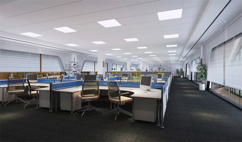 工作區(qū)域作為目前辦公場(chǎng)所中占比重最大的區(qū)域,涵蓋著公司的各個(gè)職能部門,包含了電腦操作、書寫、電話溝通、思考、工作交流、會(huì)議等辦公行為。在照明上應(yīng)結(jié)合以上辦公行為以均勻性、舒適性為設(shè)計(jì)原則,通常采用統(tǒng)一間距的布置燈具方法,并結(jié)合地面功能區(qū)域采用相應(yīng)的燈具照明。工作臺(tái)區(qū)域采用格柵燈盤,使工作空間光線均勻,并減少眩光。在集體辦公室通道區(qū)域采用節(jié)能筒燈照明,給通道補(bǔ)充光線。