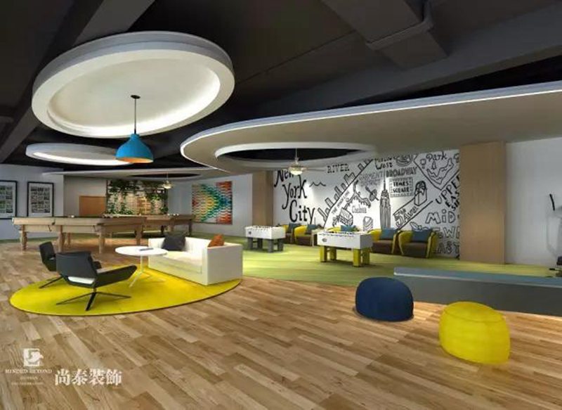 展現(xiàn)個(gè)性的黑白涂鴉墻,草綠色的地毯,有著自然紋理的木地板,帶給員工一個(gè)工作之外能夠放松身心的空間。