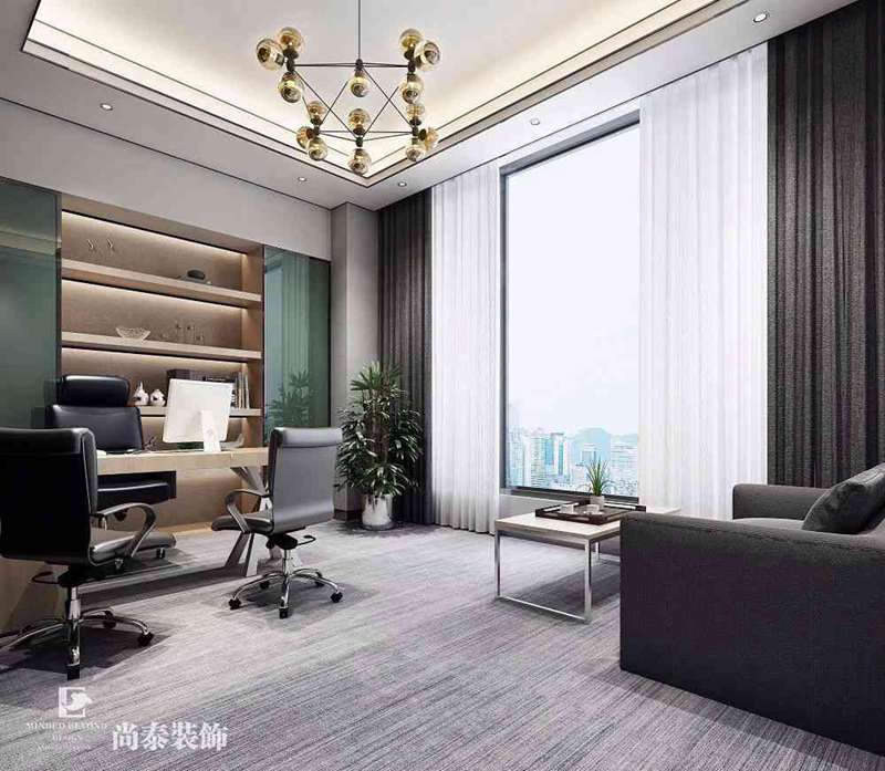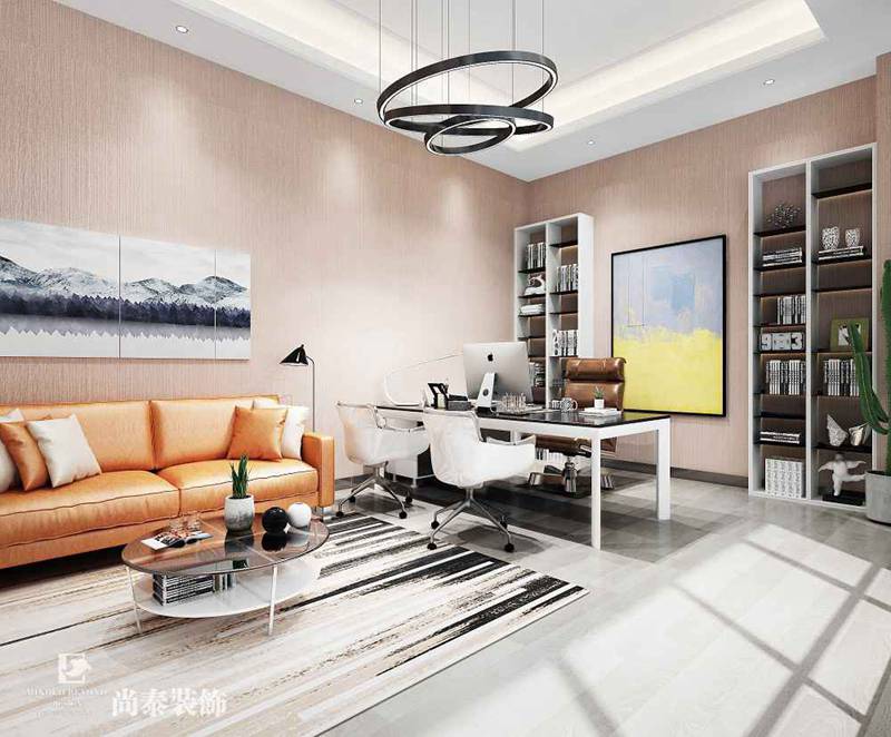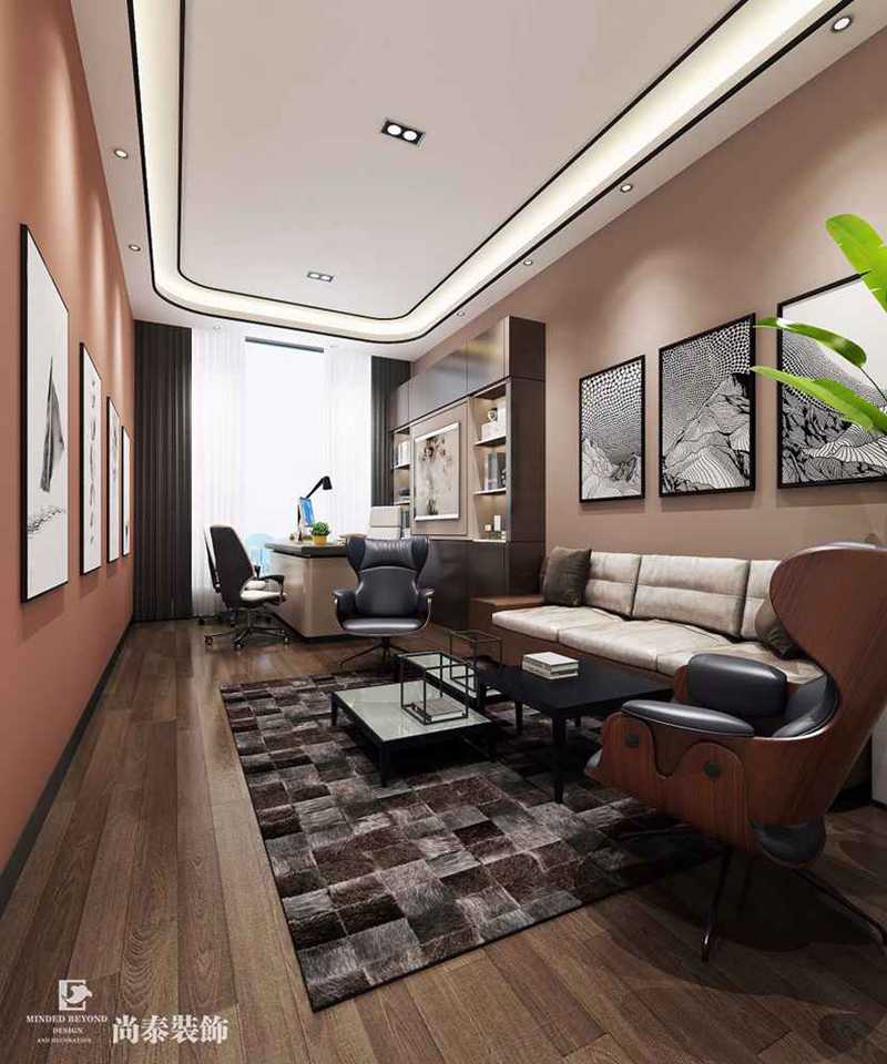 本案作為現(xiàn)代時(shí)尚風(fēng)格的辦公室與展廳一體化空間,尚泰裝飾的辦公室裝修設(shè)計(jì)定位即是簡(jiǎn)潔時(shí)尚與展廳奢華藝術(shù)漆料的展示,通過部分風(fēng)格獨(dú)特的軟裝搭配結(jié)合天花燈光效果,營(yíng)造出現(xiàn)代感極強(qiáng)的辦公氛圍和浪漫的異國(guó)情調(diào)樣板間空間。
