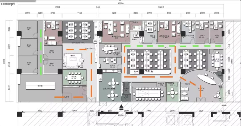 體現(xiàn)了建筑空間原有的美感,整體線條流暢,充分研究辦公空間動(dòng)線,分析人員辦公行為模式,
