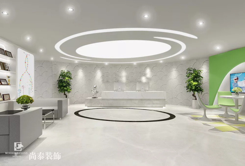 因科技生物美容垂直人群多為年輕時(shí)尚的女性,所以設(shè)計(jì)師在前廳這一塊的體現(xiàn)出國(guó)際化和高端的流線型空間。