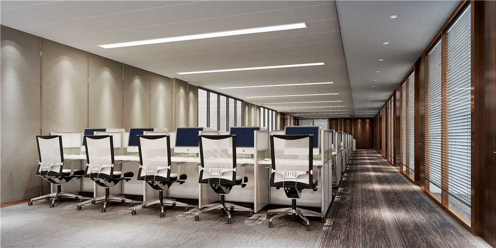 工作區(qū)域作為目前辦公場(chǎng)所中占比重最大的區(qū)域,涵蓋著公司的各個(gè)職能部門,包含了電腦操作、書寫、電話溝通、思考、工作交流、會(huì)議等辦公行為。在照明上應(yīng)結(jié)合以上辦公行為以均勻性、舒適性為設(shè)計(jì)原則,通常采用統(tǒng)一間距的布置燈具方法,并結(jié)合地面功能區(qū)域采用相應(yīng)的燈具照明。工作臺(tái)區(qū)域采用格柵燈盤,使工作空間光線均勻,并減少眩光。在集體辦公室通道區(qū)域采用節(jié)能筒燈照明,給通道補(bǔ)充光線。