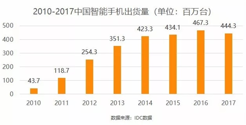 根據(jù)數(shù)據(jù)顯示,2016 年中國智能手機(jī)出貨量達(dá)到高峰共計(jì)出貨 4.673 億部,而 2017 年中國智能手機(jī)出貨量減少了將近 5%,出貨量為 4.443 億部。