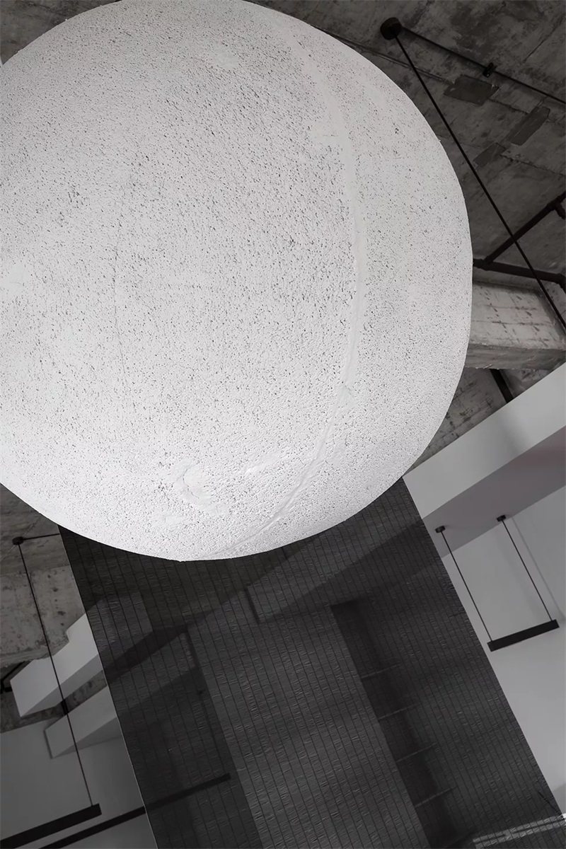 空間以方盒子作為主要框架,交談區(qū)的半圓與單一體塊共存,開放的形態(tài)空間延伸到頂上的圓球,