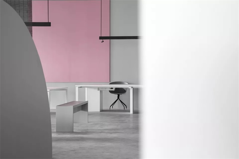 會議區(qū)成了克制的純與空,紅色沙發(fā)與粉色板塊的激進表達,完全拋開了界的比例,