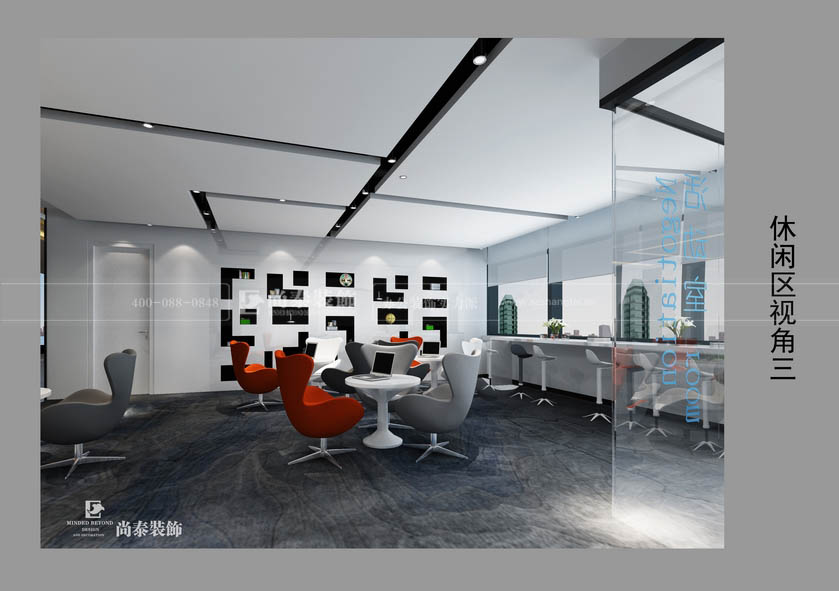 公司休閑區(qū)的設(shè)計以分割為主題,將天花分割打亂,劃分為不同的矩形,展示架也是不規(guī)則的空間排列方式,使之墻體與天花板的平面一體化效果凸顯,同時接待室的玻璃以斜面造型劃分開來,空間上彰顯著時尚感與科技感。