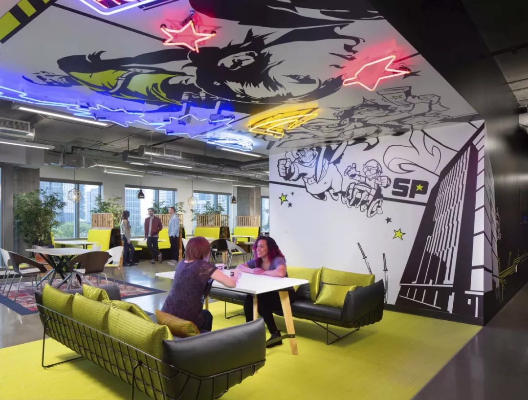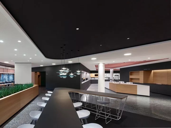 比如會議室和接待區(qū)采用吧臺式的桌椅,以及各式各樣的休閑椅、沙發(fā)、矮桌、音樂和燈光的配合,去營造俱樂部般的愜意氛圍。