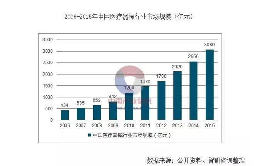 我國是人口大國,醫(yī)療器械行業(yè)屬于國家重點支持的戰(zhàn)略新興產業(yè),發(fā)展前景廣闊。伴隨著經濟的快速發(fā)展,我國醫(yī)療器械行業(yè)增長迅速,市場銷售規(guī)模由2006 年的 434 億元增長到 2015 年的 3,080 億元,但醫(yī)療器械產業(yè)依舊存在較大的市場缺口,未來醫(yī)療市場空間依然廣闊,主要驅動因素有以下幾個點:
