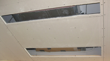 輕鋼龍骨軟墊連接防裂工藝:防止吊頂與墻體結(jié)合處開裂 因石膏板與墻體材質(zhì)不同,吊頂、隔墻與原墻體結(jié)合處極易開裂,尚 泰在兩者結(jié)合處的采取了專用軟墊片做過渡性柔性連接,以減緩不同 材質(zhì)因脹縮碰撞而引起的裂縫 | 空調(diào)風(fēng)口整板防裂工藝:防止中央空調(diào)出風(fēng)口開裂 由于使用中頻繁的細(xì)微振動,吊頂?shù)闹醒肟照{(diào)出風(fēng)口處極易開裂,尚 泰在風(fēng)口處采取了整板套割工藝,避免因為空調(diào)運行的振動與熱脹冷 縮,導(dǎo)致面層板變形而產(chǎn)生裂縫 |