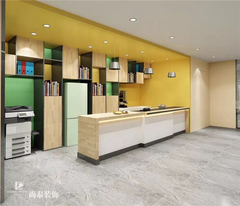 員工們在辛勤工作之余還需解壓,以亮黃色為主色調茶水間內配備了吧臺,餐椅和陳列柜,除了就餐,人們還可以在這里進行書籍閱讀,該區(qū)域的設計活潑又有朝氣!