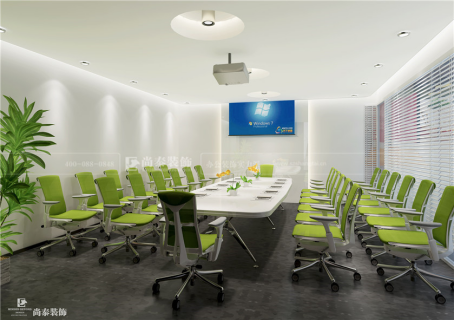 尚泰裝飾對朵唯會議室的主墻,以凸面墻為依襯,突出墻面的層次效果。明亮的會議室,簡約的純凈色調,給人以無限的暢游空間。
