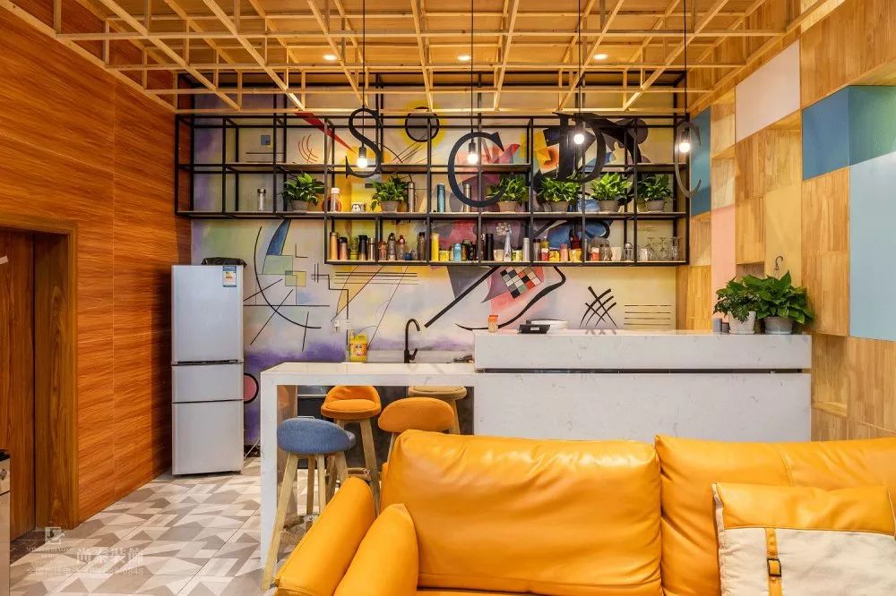 茶水間的設(shè)計(jì)采用了方正結(jié)構(gòu)的鐵藝置物架,背景墻則運(yùn)用了充滿藝術(shù)感的藝術(shù)噴漆畫,右側(cè)墻面同樣是顏色不一的四方形體塊,空間既整合統(tǒng)一又多樣化。