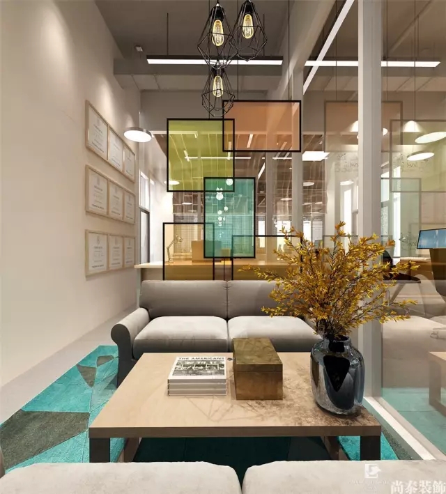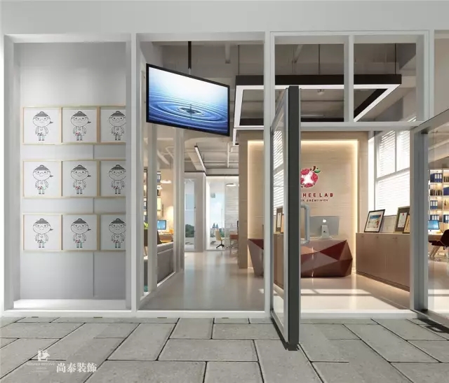 步入前廳接待區(qū),簡(jiǎn)潔清晰的前臺(tái)造型和右側(cè)的展示柜一下子吸引了人們的眼球,伴著天花板上面燈具照明的效果,該區(qū)域增加了一種開(kāi)放的氛圍和現(xiàn)代的感覺(jué),使人達(dá)成對(duì)于創(chuàng)客品牌有效的視覺(jué)溝通和傳播。