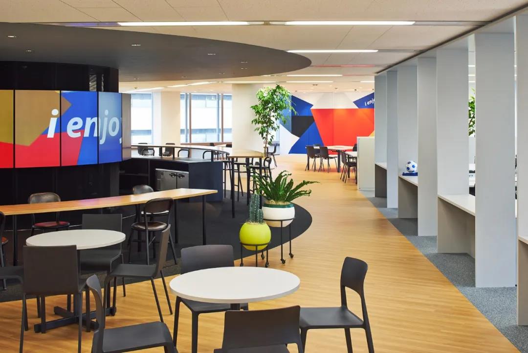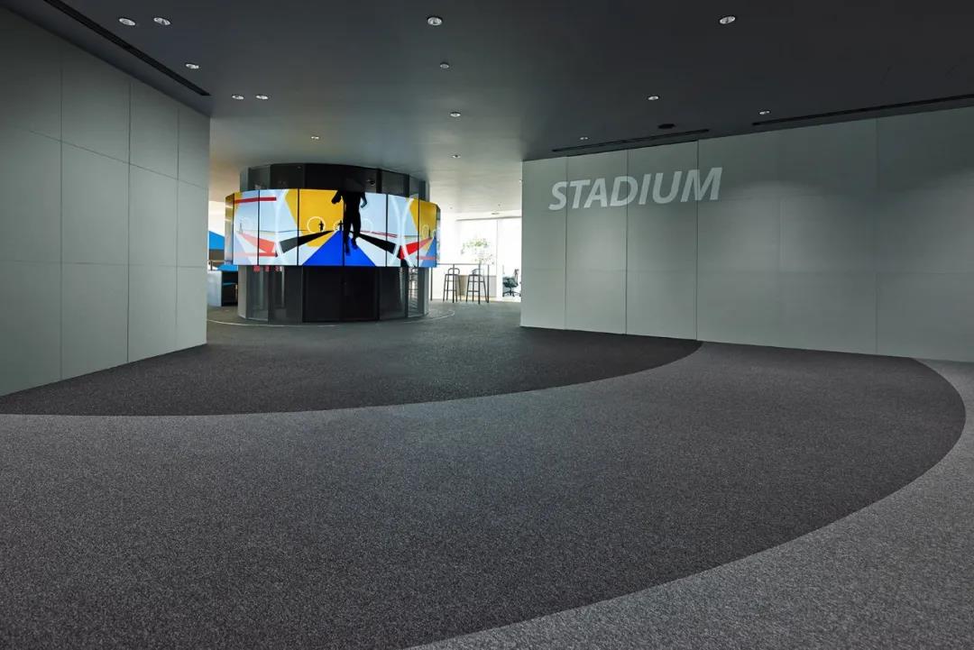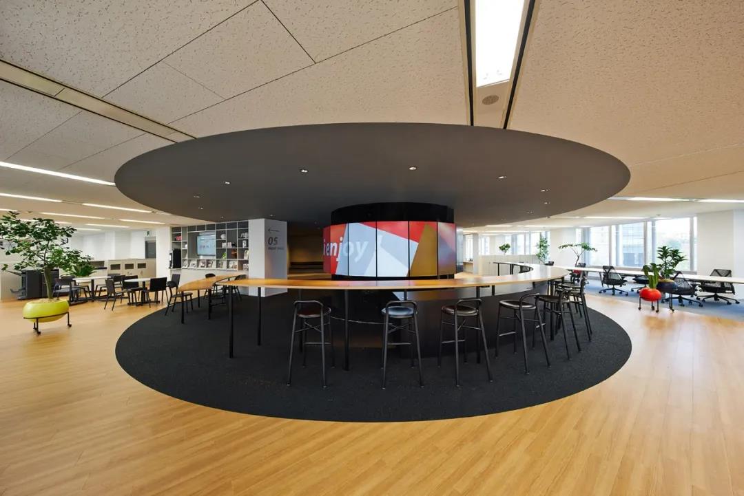 空間是一個統(tǒng)一體,是若干個彼此獨立又維系聯(lián)系的空間,構(gòu)成前后聯(lián)系、互有對比的空間環(huán)境。在該辦公室里,前有導向性和序列性的排列,后有中間的圓柱式空間,對比出項目的視覺中心,圓柱空間是休閑活動的集中地,也可以是統(tǒng)一的工作空間。